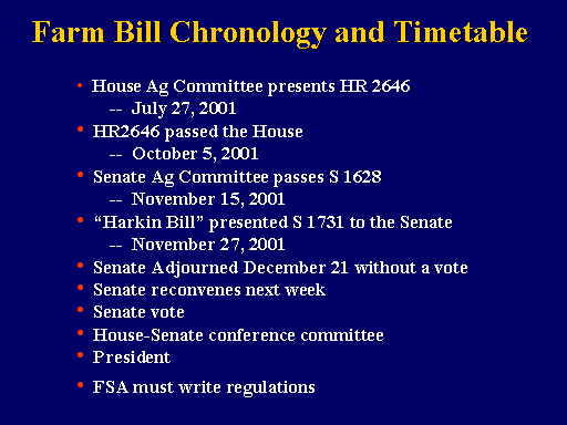 Farm Bill Chronology and Timetable<BR>  House Ag Committee presents HR 2646