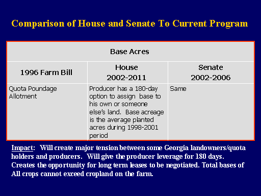 <BR>All crops cannot exceed cropland on the farm.<BR>Comparison of House and Senate To Current Program<BR>
