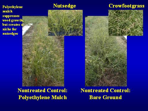 <BR>Bare Ground<BR>Nutsedge<BR>Crowfootgrass<BR>Polyethylene mulch suppresses weed growth, but creates a niche for nutsedges<BR>