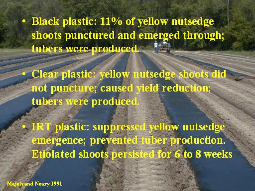 Black plastic: 11% of yellow nutsedge shoots punctured and emerged through; tubers were produced.