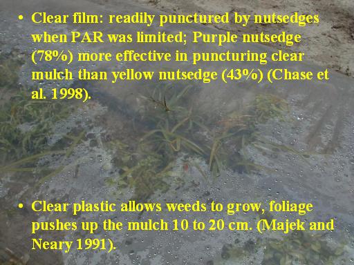 Clear film: readily punctured by nutsedges when PAR was limited; Purple nutsedge (78%) more effective in puncturing clear mulch than yellow nutsedge (43%) (Chase et al. 1998).
