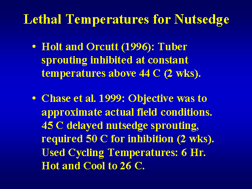 <BR>Chase et al. 1999: Objective was to approximate actual field conditions.  45 C delayed nutsedge sprouting, required 50 C for inhibition (2 wks).  Used Cycling Temperatures: 6 Hr. Hot and Cool to 26 C.<BR>