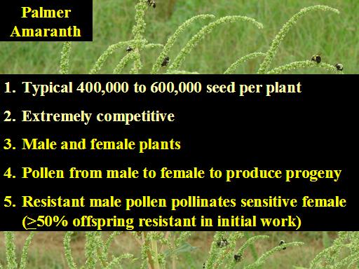 Palmer Amaranth<BR>Typical 400,000 to 600,000 seed per plant <BR>Extremely competitive <BR>Male and female plants <BR>Pollen from male to female to produce progeny <BR>Resistant male pollen pollinates sensitive female (>50% offspring resistant in initial work)<BR>