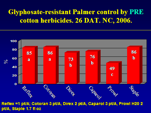 Glyphosate-resistant Palmer control by PRE cotton herbicides. 26 DAT. NC, 2006.<BR>%<BR>85 a<BR>73 b<BR>76 b<BR>49 c<BR>86 a<BR>  Reflex<BR>86b<BR>  Cotoran<BR>  Caparol<BR>  Direx<BR>  Staple<BR>  Prowl<BR>Reflex =1 pt/A; Cotoran 3 pt/A, Direx 2 pt/A, Caparol 3 pt/A, Prowl H20 2 pt/A, Staple 1.7 fl oz<BR>