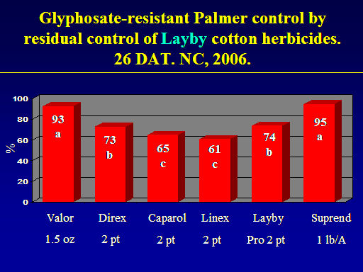 Glyphosate-resistant Palmer control by residual control of Layby cotton herbicides.  26 DAT. NC, 2006.<BR>%<BR>93 a<BR>65c<BR>74 b<BR>73 b <BR>  Direx <BR> 2 pt<BR>95 a<BR> Caparol <BR>2 pt<BR>  Layby  <BR>Pro 2 pt<BR>  Linex <BR>2 pt<BR>Suprend  <BR>1 lb/A<BR> Valor <BR> 1.5 oz<BR>61 c<BR>