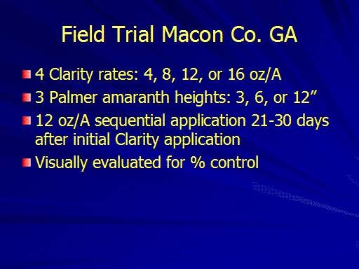 Field Trial Macon Co. GA<BR>4 Clarity rates: 4, 8, 12, or 16 oz/A <BR>3 Palmer amaranth heights: 3, 6, or 12” <BR>12 oz/A sequential application 21-30 days after initial Clarity application <BR>Visually evaluated for % control <BR>