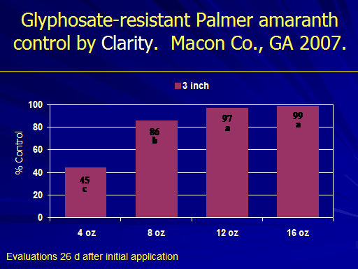 Glyphosate-resistant Palmer amaranth control by Clarity.  Macon Co., GA 2007.<BR>Evaluations 26 d after initial application<BR>45c<BR>86b<BR>97 a<BR>99 a<BR>% Control<BR>