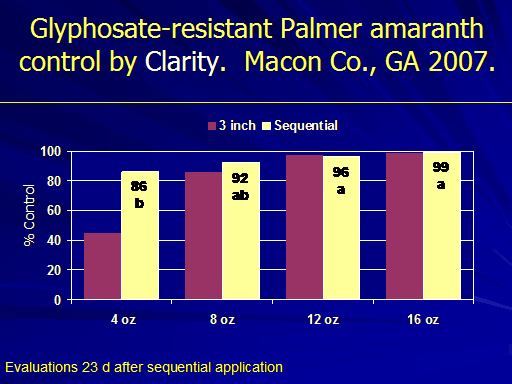 Glyphosate-resistant Palmer amaranth control by Clarity.  Macon Co., GA 2007.<BR>Evaluations 23 d after sequential application<BR>99a<BR>86b<BR>92ab<BR>96a<BR>% Control<BR>