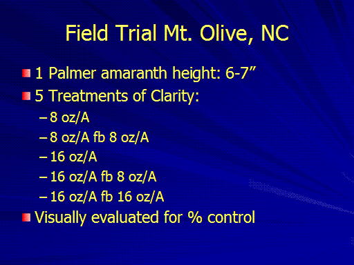 Field Trial Mt. Olive, NC<BR>1 Palmer amaranth height: 6-7” <BR>5 Treatments of Clarity: <BR>8 oz/A  <BR>8 oz/A fb 8 oz/A <BR>16 oz/A <BR>16 oz/A fb 8 oz/A <BR>16 oz/A fb 16 oz/A <BR>Visually evaluated for % control<BR>