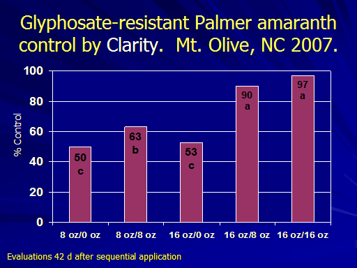 Glyphosate-resistant Palmer amaranth control by Clarity.  Mt. Olive, NC 2007.<BR>Evaluations 42 d after sequential application<BR>% Control<BR>