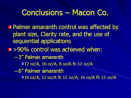 Conclusions – Macon Co.<BR>Palmer amaranth control was affected by plant size, Clarity rate, and the use of sequential applications <BR>>90% control was achieved when: <BR>3” Palmer amaranth <BR>12 oz/A, 16 oz/A, 8 oz/A fb 12 oz/A <BR>6” Palmer amaranth <BR>16 oz/A, 12 oz/A fb 12 oz/A, 16 oz/A fb 12 oz/A<BR>