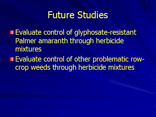Future Studies<BR>Evaluate control of glyphosate-resistant Palmer amaranth through herbicide mixtures <BR>Evaluate control of other problematic row-crop weeds through herbicide mixtures<BR>