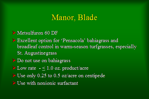 Manor, Blade<BR>Metsulfuron 60 DF <BR>Excellent option for ‘Pensacola’ bahiagrass and broadleaf control in warm-season turfgrasses, especially St. Augustinegrass <BR>Do not use on bahiagrass  <BR>Low rate  - < 1.0 oz. product/acre <BR>Use only 0.25 to 0.5 oz/acre on centipede <BR>Use with nonionic surfactant <BR>