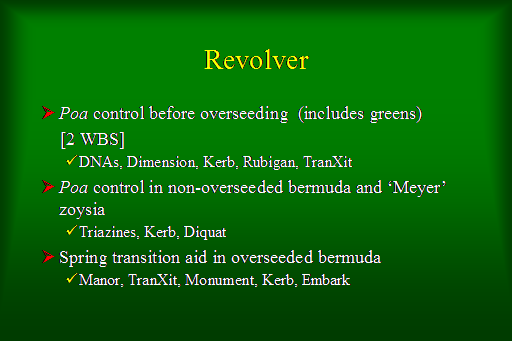 Revolver<BR>Poa control before overseeding  (includes greens) <BR>    [2 WBS] <BR>DNAs, Dimension, Kerb, Rubigan, TranXit <BR>Poa control in non-overseeded bermuda and ‘Meyer’ zoysia <BR>Triazines, Kerb, Diquat <BR>Spring transition aid in overseeded bermuda <BR>Manor, TranXit, Monument, Kerb, Embark<BR>