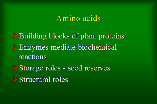 Amino acids<BR>Building blocks of plant proteins <BR>Enzymes mediate biochemical reactions <BR>Storage roles - seed reserves <BR>Structural roles<BR>