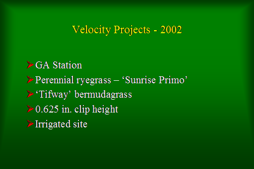 Velocity Projects - 2002<BR>GA Station <BR>Perennial ryegrass – ‘Sunrise Primo’ <BR>‘Tifway’ bermudagrass <BR>0.625 in. clip height <BR>Irrigated site<BR>