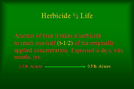 Herbicide ½ Life<BR>Amount of time it takes a herbicide <BR>to reach one-half (t-1/2) of the originally <BR>applied concentration.  Expressed in days, wks, <BR>months, yrs.<BR>1.0 lb. Ai/acre                                            0.5 lb. Ai/acre<BR>