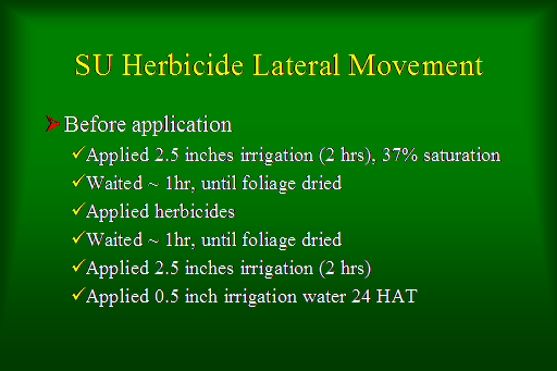 SU Herbicide Lateral Movement<BR>Before application <BR>Applied 2.5 inches irrigation (2 hrs), 37% saturation <BR>Waited ~ 1hr, until foliage dried <BR>Applied herbicides <BR>Waited ~ 1hr, until foliage dried <BR>Applied 2.5 inches irrigation (2 hrs) <BR>Applied 0.5 inch irrigation water 24 HAT<BR>