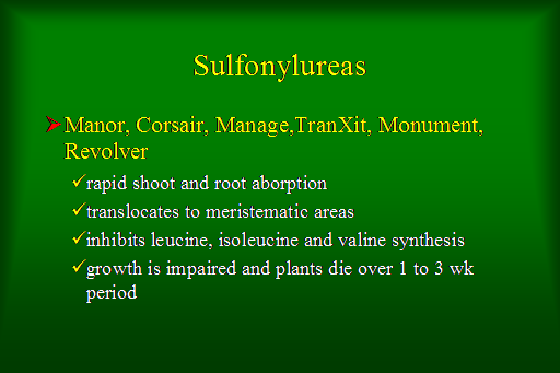 Sulfonylureas<BR>Manor, Corsair, Manage,TranXit, Monument, Revolver <BR>rapid shoot and root aborption <BR>translocates to meristematic areas <BR>inhibits leucine, isoleucine and valine synthesis <BR>growth is impaired and plants die over 1 to 3 wk period<BR>