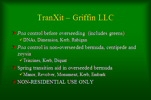 TranXit – Griffin LLC<BR>Poa control before overseeding  (includes greens) <BR>DNAs, Dimension, Kerb, Rubigan <BR>Poa control in non-overseeded bermuda, centipede and zoysia <BR>Triazines, Kerb, Diquat <BR>Spring transition aid in overseeded bermuda <BR>Manor, Revolver, Monument, Kerb, Embark <BR>NON-RESIDENTIAL USE ONLY<BR>