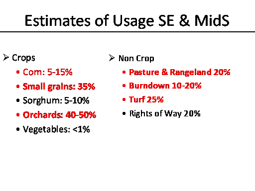 Crops <BR>Corn: 5-15% <BR>Small grains: 35% <BR>Sorghum: 5-10% <BR>Orchards: 40-50% <BR>Vegetables: <1% <BR>Non Crop <BR>Pasture & Rangeland 20% <BR>Burndown 10-20% <BR>Turf 25% <BR>Rights of Way 20% <BR> <BR>Estimates of Usage SE & MidS<BR>