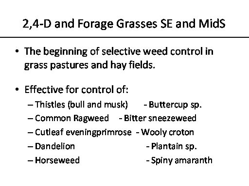 2,4-D and Forage Grasses SE and MidS<BR>The beginning of selective weed control in grass pastures and hay fields. <BR> 	 <BR>Effective for control of: <BR>Thistles (bull and musk)	  - Buttercup sp. <BR>Common Ragweed	  - Bitter sneezeweed <BR>Cutleaf eveningprimrose  - Wooly croton <BR>Dandelion			   - Plantain sp. <BR>Horseweed			   - Spiny amaranth<BR>
