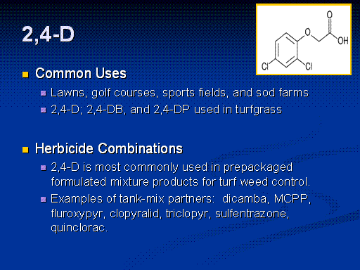 2,4-D<BR>Common Uses  <BR>Lawns, golf courses, sports fields, and sod farms <BR>2,4-D; 2,4-DB, and 2,4-DP used in turfgrass <BR> <BR>Herbicide Combinations <BR>2,4-D is most commonly used in prepackaged formulated mixture products for turf weed control. <BR>Examples of tank-mix partners:  dicamba, MCPP, fluroxypyr, clopyralid, triclopyr, sulfentrazone, quinclorac.<BR>