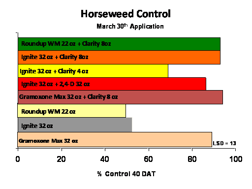 Horseweed Control <BR>0<BR>20<BR>40<BR>60<BR>80<BR>100<BR>Ignite 32 oz <BR>Ignite 32 oz + 2,4-D 32 oz<BR>Roundup WM 22 oz + Clarity 8oz<BR>Ignite 32 oz + Clarity 4 oz<BR>Ignite 32 oz + Clarity 8oz<BR>LSD = 13<BR>% Control 40 DAT<BR>March 30th Application<BR>Roundup WM 22 oz<BR>Gramoxone Max 32 oz + Clarity 8 oz<BR>Gramoxone Max 32 oz <BR>