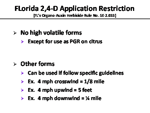 FLorida 2,4-D Application Restriction (FL’s Organo-Auxin Herbicide Rule No. 5E-2.033)<BR>No high volatile forms <BR>Except for use as PGR on citrus <BR>No high volatile forms <BR>Except for use as PGR on citrus <BR>Other forms <BR>Can be used if follow specific guidelines <BR>Ex.  4 mph crosswind = 1/8 mile <BR>Ex.  4 mph upwind = 5 feet <BR>Ex.  4 mph downwind = ¼ mile <BR>