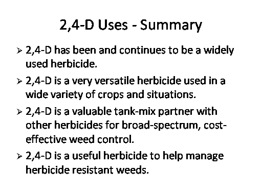 2,4-D Uses - Summary<BR>2,4-D has been and continues to be a widely used herbicide. <BR>2,4-D is a very versatile herbicide used in a wide variety of crops and situations. <BR>2,4-D is a valuable tank-mix partner with other herbicides for broad-spectrum, cost-effective weed control. <BR>2,4-D is a useful herbicide to help manage herbicide resistant weeds. <BR> <BR>