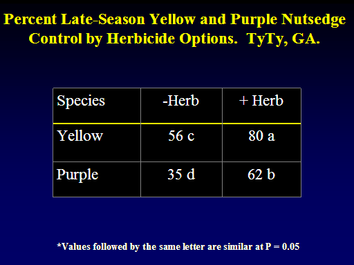 Percent Late-Season Yellow and Purple Nutsedge Control by Herbicide Options.  TyTy, GA.  <BR>*Values followed by the same letter are similar at P = 0.05<BR>