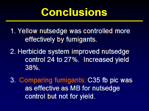 Conclusions<BR> Yellow nutsedge was controlled more 	effectively by fumigants.