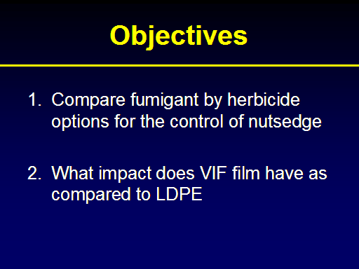 Objectives<BR>Compare fumigant by herbicide options for the control of nutsedge