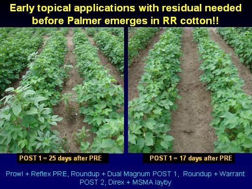 Early topical applications with residual needed before Palmer emerges in RR cotton!!<BR>Prowl + Reflex PRE, Roundup + Dual Magnum POST 1,  Roundup + Warrant POST 2, Direx + MSMA layby<BR>POST 1 = 25 days after PRE<BR>POST 1 = 17 days after PRE<BR>