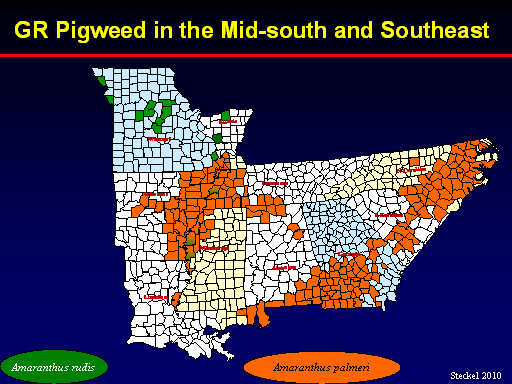 Amaranthus rudis<BR>Amaranthus palmeri<BR>Tennessee<BR>Missouri<BR>Illinois<BR>Mississippi<BR>Georgia<BR>S Carolina<BR>N Carolina<BR>Alabama<BR>Louisiana<BR>Arkansas<BR>GR Pigweed in the Mid-south and Southeast<BR>Steckel 2010<BR>