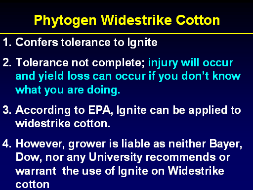 Phytogen Widestrike Cotton <BR>Confers tolerance to Ignite <BR>Tolerance not complete; injury will occur and yield loss can occur if you don’t know what you are doing. <BR>According to EPA, Ignite can be applied to widestrike cotton. <BR>However, grower is liable as neither Bayer,  Dow, nor any University recommends or warrant  the use of Ignite on Widestrike cotton<BR>
