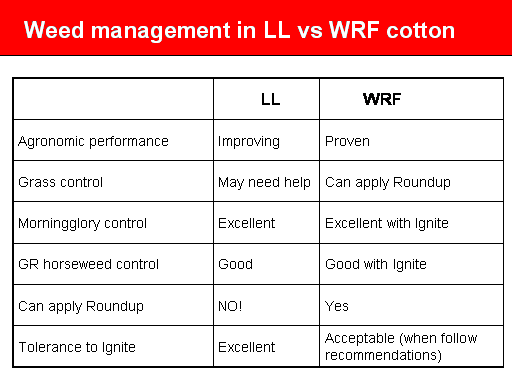 Weed management in LL vs WRF cotton <BR>	<BR>