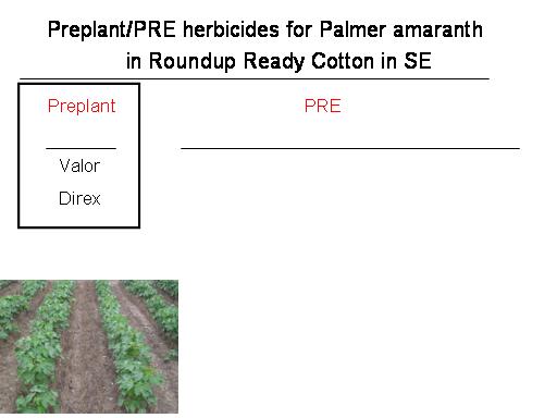 Preplant/PRE herbicides for Palmer amaranth <BR>in Roundup Ready Cotton in SE <BR>     Preplant				 PRE 	 		                   <BR>					   		 <BR>       Valor		 <BR>       Direx			 <BR>				<BR>