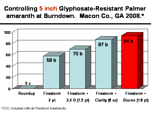 Controlling 5 inch Glyphosate-Resistant Palmer amaranth at Burndown.  Macon Co., GA 2008.*<BR>0 c<BR>87 b<BR>94 a<BR>58 b<BR>Roundup<BR>Firestorm <BR>2 pt<BR>70 b<BR>Firestorm + <BR>2,4-D (1.5 pt)<BR>Firestorm + <BR>Clarity (8 oz)<BR>Firestorm + <BR>Diuron (1.8 pt)  <BR>*COC included with all Firestorm treatments<BR>