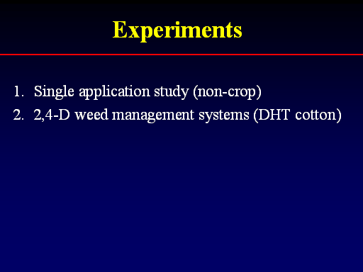 Experiments<BR>1.  Single application study (non-crop) <BR>2.  2,4-D weed management systems (DHT cotton)<BR>