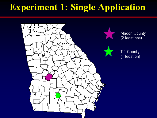 Experiment 1: Single Application<BR>Macon County <BR>(2 locations)<BR>Tift County <BR>(1 location)<BR>