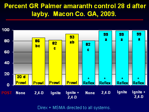Percent GR Palmer amaranth control 28 d after layby.  Macon Co. GA, 2009.<BR>86 bc<BR>82 c<BR>20 d<BR>93 ab<BR>99 a<BR>99 a<BR>99 a<BR>2,4-D<BR>Ignite + 2,4-D<BR>None<BR>Prowl<BR>Ignite <BR>+ Reflex<BR>Prowl<BR>Prowl<BR>Prowl<BR>+ Reflex<BR>+ Reflex<BR>+ Reflex<BR>POST<BR>2,4-D<BR>Ignite + 2,4-D<BR>None<BR>Ignite <BR>82 c<BR>Direx + MSMA directed to all systems. <BR>