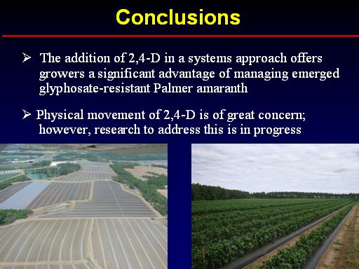 Conclusions <BR> <BR>  The addition of 2,4-D in a systems approach offers 	growers a significant advantage of managing emerged 	glyphosate-resistant Palmer amaranth <BR> <BR> Physical movement of 2,4-D is of great concern; 	however, research to address this is in progress <BR>