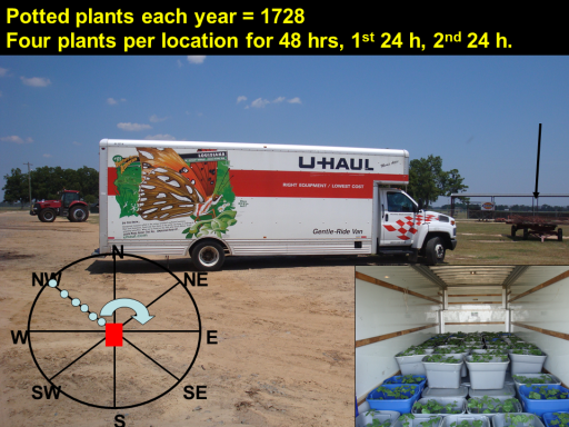 Potted plants each year = 1728 Four plants per location for 48 hrs, 1st 24 h, 2nd 24 h. <BR>