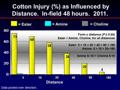 Cotton Injury (%) as Influenced by Distance.  In-field 48 hours.  2011.<BR>73<BR>69<BR>58<BR>38<BR>20<BR>4<BR>5<BR>10<BR>40<BR>160<BR>20<BR>80<BR>= Ester<BR>Data pooled over direction.<BR>= Amine<BR>Distance<BR>= Choline<BR>Form x distance (P = 0.05) <BR>Ester > Amine, Choline, for all distances<BR>Ester: 5 > 10 > 20 > 40 > 80 > 160 <BR>Amine: 5 > 10 > 20–160 <BR> <BR>Amine 5–10 > Choline 5-10 <BR>