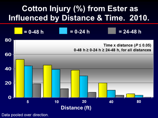 Cotton Injury (%) from Ester as Influenced by Distance & Time.  2010.<BR>5<BR>10<BR>40<BR>20<BR>80<BR>= 0-48 h<BR>Data pooled over direction.<BR>= 0-24 h<BR>= 24-48 h<BR>Distance (ft)<BR>Time x distance (P = 0.05) <BR>0-48 h = 0-24 h = 24-48 h, for all distances <BR>