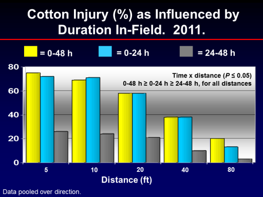 Cotton Injury (%) as Influenced by Duration In-Field.  2011.<BR>5<BR>10<BR>40<BR>20<BR>80<BR>= 0-48 h<BR>Data pooled over direction.<BR>= 0-24 h<BR>= 24-48 h<BR>Distance (ft)<BR>Time x distance (P = 0.05) <BR>0-48 h = 0-24 h = 24-48 h, for all distances <BR>