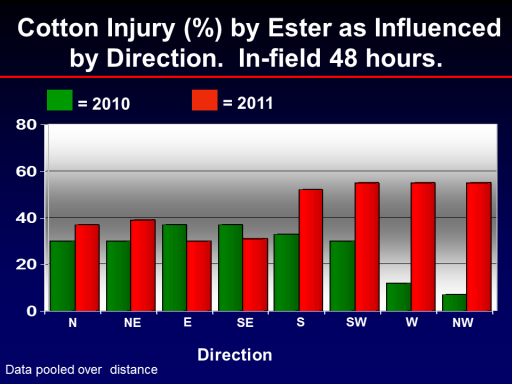 Cotton Injury (%) by Ester as Influenced by Direction.  In-field 48 hours.  <BR>N<BR>NE<BR>SE<BR>NW<BR>E<BR>Data pooled over  distance<BR>S<BR>SW<BR>W<BR>Direction<BR>= 2010<BR>= 2011<BR>