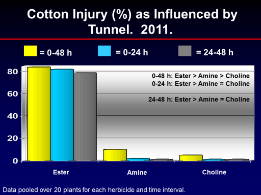 Cotton Injury (%) as Influenced by Tunnel.  2011.<BR>Ester<BR>Amine<BR>Choline<BR>= 0-48 h<BR>Data pooled over 20 plants for each herbicide and time interval.<BR>= 0-24 h<BR>= 24-48 h<BR>0-48 h: Ester > Amine > Choline <BR>0-24 h: Ester > Amine = Choline <BR> <BR>24-48 h: Ester > Amine = Choline<BR>