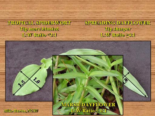 TROPICAL SPIDERWORT <BR>Tip more blunted <BR>L:W Ratio <3:1<BR>SPREADING DAYFLOWER <BR>Tip sharper <BR>L:W Ratio >4:1<BR>Mike Burton, NCSU<BR>4.3<BR>1.0<BR>1.5<BR>1.0<BR>MARSH DAYFLOWER <BR>L:W Ratio ~ 6:1<BR>